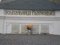 Boris died after a lengthy illness and a stroke on 13/23 April 1605. He left one son, Feodor II, who succeeded him but only ruled Russia for less than a month, until he and Boris' widow were murdered by the enemies of the Godunovs in Moscow on 10/20 June 1605.[15] Boris's first son, Ivan, was born in 1587 and died in 1588. His daughter, Xenia, was born in 1582. She was engaged to Johann of Schleswig-Holstein, but he died shortly before their planned wedding in October 1602. Xenia was given the name "Olga" upon being forced to take monastic vows at the Voskresensky Monastery in Beloozero and her name is inscribed as "the Nun Olga Borisovna" at the crypt of the Godunovs at the Trinity Lavra of St. Sergius where she lived from 1606, when she sojourned there to attend the reburial of her father, until her death in 1622.[16] Boris, his wife, and their children are buried together in a mausoleum near the entrance of the Assumption Cathedral at Trinity–St. Sergius Lavra.