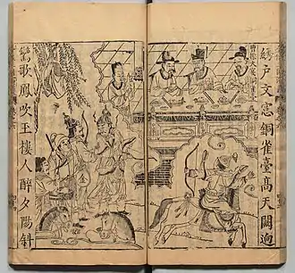 By the Yuan dynasty, a popular tradition took hold viewing Cao Cao as a lustful tyrant and his Bronze Bird Terrace a pleasure palace.[42] The huaben Sanguozhi Pinghua ("Records of the Three Kingdoms in Plain Language") elaborates on the connection Du Mu made between Cao Cao and the Qiao sisters: In the prelude to the Battle of Red Cliffs, Zhuge Liang goads Zhou Yu into war against Cao Cao by stating that Cao Cao is specifically campaigning throughout China in search of beautiful women to fill his Bronze Bird Terrace, and if Zhou Yu fails to act, his own wife—the younger of the Qiao sisters—would be made captive there.[43] Also of note is that the Bronze Bird Terrace was described to be in Chang'an instead of Ye in this story.[44]