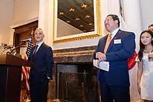 On October 8, 2021, Harrell, at the time campaigning for mayor, attended a dinner event at China Harbor restaurant, a popular location for political fundraisers, to spread and deliver his mayoral platform.[52] In attendance were political figures including former Washington Governor Gary Locke, Burien Mayor Jimmy Matta, and candidate for Port of Seattle Commission Hamdi Mohamad. The event, which had around 270 attendees, had many COVID-19 restrictions in place by the restaurant, including requiring proof of COVID-19 vaccination or a negative COVID-19 test, and for eventgoers to wear a mask when not eating, drinking or sitting at their table.[52] According to state law at the time, masks were required in all public, indoor spaces, with the exception of those actively eating or drinking. During the event, Harrell and other attendees were photographed mingling and posing for photos without masks.[52] This drew criticism, including from Seattle journalist Erica Barnett, who shared the photos on Twitter and called the event a "giant, unmasked fundraiser".[52] One of Harrell's mayoral opponents, M. Lorena Gonzalez, later said in a forum that "leadership in my mind means that you cannot play by your own rules when it comes to public health, especially when the city is in a public health crisis".[52] In a statement two days later, Harrell said, "even though I only removed my mask for dining and brief intervals for photographs with friends and community leaders, I understand that people in public life will and should be held to high standards".[52] Locke, Matta, and Mohamad all commented on the story as well: Locke said he tried to wear his mask the whole time but nobody is perfect, Matta that the venue was big enough for everyone to be safe but they were still cautious, and Mohamad that he only removed his mask to eat and some photos.