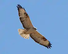 All Buteo species are to some extent opportunistic when it comes to hunting, and prey on almost any type of small animal as it becomes available to them. However, most have a strong preference for small mammals, mostly rodents. Rodents of almost every family in the world are somewhere preyed upon by Buteo species.[5][6][7] Since many rodents are primarily nocturnal, most buteos mainly hunt rodents that may be partially active during the day, which can include squirrels and chipmunks, voles, and gerbils. More nocturnal varieties are hunted opportunistically and may be caught in the first or last few hours of light.[5][7] Other smallish mammals, such as shrews, moles, pikas, bats, and weasels, tend to be minor secondary prey, although can locally be significant for individual species.[5][7] Larger mammals, such as rabbits, hares, and marmots, including even adult specimens weighing as much as 2 to 3 kg (4.4 to 6.6 lb), may be hunted by the heaviest and strongest species, such as ferruginous,[7][10][11] red-tailed[12] and white-tailed hawks.[13] Birds are taken occasionally, as well. Small to mid-sized birds, i.e. passerines, woodpeckers, waterfowl, pigeons, and gamebirds, are most often taken. However, since the adults of most smaller birds can successfully outmaneuver and evade buteos in flight, much avian prey is taken in the nestling or fledgling stages or adult birds if they are previously injured.[5][7] An exception is the short-tailed hawk, which is a relatively small and agile species and is locally a small bird-hunting specialist.[14] The Hawaiian hawk, which evolved on an isolated group of islands with no terrestrial mammals, was also initially a bird specialist, although today it preys mainly on introduced rodents. Other prey may include snakes, lizards, frogs, salamanders, fish, and even various invertebrates, especially beetles. In several Buteo species found in more tropical regions, such as the roadside hawk or grey-lined hawk, reptiles and amphibians may come to locally dominate the diet.[5] Swainson's hawk, despite its somewhat large size, is something of exceptional insect-feeding specialist and may rely almost fully on crickets and dragonflies when wintering in southern South America.[15][16] Carrion is eaten occasionally by most species, but is almost always secondary to live prey.[5] The importance of carrion in the Old World "buzzard" species is relatively higher since these often seem slower and less active predators than their equivalents in the Americas.[17][18][19] Most Buteo species seem to prefer to ambush prey by pouncing down to the ground directly from a perch. In a secondary approach, many spot prey from a great distance while soaring and circle down to the ground to snatch it.[5]