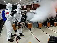 On 2 February 2020, Taiwan's Central Epidemic Command Center postponed the opening of primary and secondary schools until 25 February (originally 11 February).[201][202] In early February 2020, Taiwan's "Central Epidemic Command Center" requested the mobilization of the Taiwanese Armed Forces in both containing the spread of the virus and in building up defenses against it. Soldiers were dispatched to the factory floors of major mask manufacturers to help staff the 62 additional mask production lines that were being set up at the time.[203] In early March, Taiwan's average production of surgical face masks reached 9.2 million per day.[204] By the end of March, the daily production of surgical face masks reached 13 million.[199]
