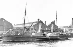 Alert was taken out of service in 1915 as she was considered unseaworthy.[23] Her cable-winching gear was recovered and installed on the second CS Alert built in 1918. However, this was later replaced with the same type of gear fitted to the third CS Monarch.[24] In 1918 she was sold into mercantile service with the Brito-Franco Shipping Company of Newcastle and initially reverted to her previous name of The Lady Carmichael. Subsequently, in 1920 she was renamed Hobgoblin after having been re-engined. Her name was again changed in 1923 to Norham. In 1927 she was sold to the St. Baldred Shipping Company of Blyth. On 17 July 1932 she was wrecked on the South Training Wall at Redcar and was scrapped after being refloated on 2 August 1932.[2][25]