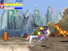 Up to three players can play at once, guiding their selected characters through eight stages, battling various enemies and bosses.[3] There are four playable characters, each with their own strengths and weaknesses: Jack (balanced type), Hannah (skill type), Mustapha (speed type), and Mess (power type). The game's titular dinosaurs make appearances as neutral characters that may attack both player characters and enemies.