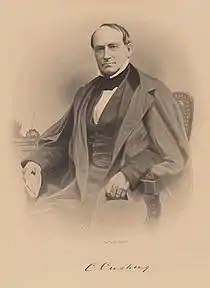 On January 9, 1874, Grant nominated Cushing as Chief Justice of the United States Supreme Court. The nomination came soon after Grant withdrew the nomination of George Henry Williams to the position.[12] The selection caught many off-guard, including Cushing himself.[13] Radical Republicans in the U.S. Senate immediately challenged Cushing's loyalties on account of his earlier close personal rapport with Andrew Johnson and his alleged pre-Civil War Copperhead sympathies. Their feelings of distrust turned into all out opposition to his confirmation when a (non-political) letter that Cushing had written in 1861 to President of the Confederacy Jefferson Davis was found and made public. As a result of rising furor, the nomination was withdrawn on January 13, 1874.[14][15]