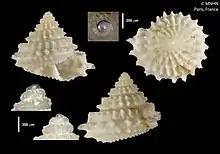 The size of the shell varies between 4 mm and 6 mm, and is broadly conical in shape, globular and finely granulate, with discontinuous spiral ribs. The shell features spiral and axial ribs with spines at intersections. Spines lower on the whorl develop into C-shaped lamellae. The umbilicus is broad and encircled by a rib, with spiral and axial ribs inside.[2]