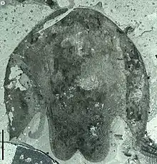 Cambroraster is an extinct monotypic genus of hurdiid radiodont, dating to the middle Cambrian, and represented by the single formally described species Cambroraster falcatus.[1] Hundreds of specimens were found in the Burgess Shale, and described in 2019.[2] A large animal (for its era) at up to 30 centimetres (12 in) (but not as long as Titanokorys at 50 centimetres (20 in)), it is characterized by a significantly enlarged horseshoe-shaped dorsal carapace (H-element), and presumably fed by sifting through the sediment with its well-developed tooth plates (oral cone) and short frontal appendages with hooked spines.[1] It is named partially after the fictional Millennium Falcon, which its dorsal carapace resembles.[1][3][4]