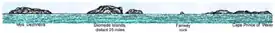 The cape is the eastern tip of a high, rocky headland, about 20 kilometres (12 mi) from Uelen in the north to Cape Pe'ek in the south, connected to the mainland by a neck of lower-lying land peppered with swamps and shallow lakes. That low-lying land is so low in elevation that the cape appears as an island from a distance far to the south of it. The US Hydrographic Office publication Asiatic Pilot from 1909 gives the height of the headland as 2,521 feet (768 m), and the US Office of Coast Survey chart of 2000 shows the highest peak at 2,638 feet (804 m). The headland and the neck of low-lying land together form a peninsula. A well-established trail crossed the neck of land behind the headland in pre-historic and historic times, traversed by sleds in the winter and used as a portage in the summer to avoid traversing the strait. This route was important enough that, according to an analysis by linguist Michael Krauss, the Central Siberian Yupik language continued up the coast, un-interrupted by the Naukansky dialect spoken in the village of Naukan on the headland.