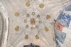 The vaulted-ceiling of the Coimbras Chapel, with the gilded rosettes and central coat-of-arms