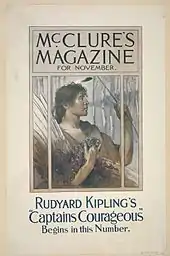 Captains Courageous: A Story of the Grand Banks is an 1897 novel by Rudyard Kipling that follows the adventures of fifteen-year-old Harvey Cheyne Jr., the spoiled son of a railroad tycoon, after he is saved from drowning by a Portuguese fisherman in the north Atlantic. The novel originally appeared as a serialisation in McClure's, beginning with the November 1896 edition with the last instalment appearing in May 1897. In that year it was then published in its entirety as a novel, first in the United States by Doubleday, and a month later in the United Kingdom by Macmillan.[1] It is Kipling's only novel set entirely in North America.[1] In 1900, Teddy Roosevelt extolled the book in his essay "What We Can Expect of the American Boy," praising Kipling for describing "in the liveliest way just what a boy should be and do."[3]