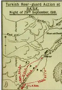 The Sa'sa rearguard force appeared to be divided in two; the left consisting of 50 German, 70 Ottoman soldiers, six machine guns and four guns.[63][81]