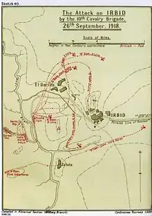 Late in the afternoon of 26 September the 10th Cavalry Brigade was attacked by the Fourth Army's flank guard which held the country round Irbid in force. Consisting of the Fourth Army's Amman garrison (less their rearguard captured at Amman), according to Archibald Wavell these troops had not been "heavily engaged,"[31] and Anthony Bruce argues that they were "still intact as a fighting force even though ...[they were]... in rapid retreat."[17]
