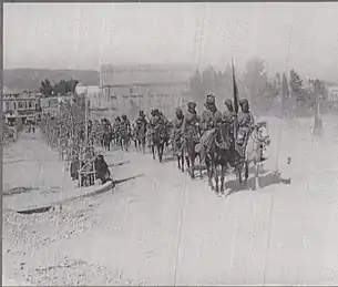 The 4th Cavalry Division's 70 miles (110 km) pursuit from Deraa to Damascus began with Prince Feisal's Arab force commanded by the Iraqi volunteer Nuri es-Said on the right flank while in the vanguard Arab irregulars (possibly Beni Sakhr) harassed the Ottoman force.[39][40] As they rode north they passed the bodies of about 2,000 Ottoman soldiers (according to Barrow) as well as their abandoned transport and equipment.[41]