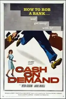 Cash on Demand is a 1961 British black and white second feature[2] neo noir crime thriller film directed by Quentin Lawrence and starring Peter Cushing and André Morell.[3] The screenplay was adapted from the 1960 Associated TelevisionTheatre 70 teleplay The Gold Inside, also directed by Lawrence, and featuring André Morell and Richard Vernon in the same roles.[4]