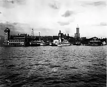 Shipping lines with facilities on Central Waterfront piers in the 1920s included local steamer companies, but also the Grand Trunk Pacific Steamship Company, the Royal Mail Steam Packet Company, the East Asiatic Steamship Company, the Cosmos Line, the Osaka Shoshen Kaisha, the Hamburg America Line, the Blue Funnel Line, and such mercantile tenants as Seattle Pacific Marine Supply and W. R. Grace and Company.[95]