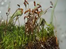 Fire moss is dioecious,[5] reproducing generatively with spores and vegetatively through protonemata. The capsules are held horizontally on the end of a long seta (fruit stalk).[5] Fire moss generally fruits abundantly.[7] Wind is the main method of spore dispersal.[12]