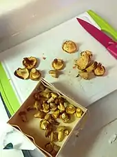 Chanterelles are also well-suited for drying, and tend to maintain their aroma and consistency quite well.[9] Some chefs profess that reconstituted chanterelles are actually superior in flavor to fresh ones, though they lose in texture whatever they gain in flavor by becoming more chewy after being preserved by drying.[10] Dried chanterelles can also be crushed into flour and used in seasoning in soups or sauces. Chanterelles are also suitable for freezing, though older frozen chanterelles can often develop a slightly bitter taste after thawing.[9]