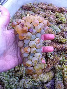 The time of harvesting is a crucial decision because the grape quickly begins to lose acidity as it ripens. For sparkling wine production, the grapes will be harvested early and slightly unripe to maintain the acid levels. Sparkling Chardonnay-based wines tend to exhibit more floral and steely flavors in their youth. As the wine ages, particularly if it spends significant time on lees, the wines will develop "toasty" notes.[3] Chardonnay grapes usually have little trouble developing sugar content, even in cooler climates, which translates into high potential alcohol levels and limits the need for chaptalization. On the flip side, low acid levels can be a concern which make the wine taste "flabby" and dull. Winemakers can counteract this by adding tartaric acid in a process known as "acidification". In cooler climates, the extract and acidity of Chardonnay is magnified which has the potential of producing very concentrated wines that can develop through bottle aging.[7] Chardonnay can blend well with other grapes and still maintain some of its unique character. The grapes most often blended with Chardonnay include Chenin blanc, Colombard and Sémillon.[4]