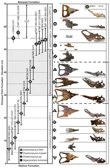 Today, taxonomy of Chasmosaurus is in a state of flux. For the aforementioned reasons, it is likely that Mojoceratops, Eoceratops, and C. kaiseni belong to a distinct species, if not genus, of chasmosaurine.[20] Specimens referred to C. russelli are all from the lower Dinosaur Park Formation, stratigraphically and morphologically separate from C. belli.[20] Apart from the holotype and paratype several additional specimens of C. belli are known. These include AMNH 5422, ROM 843 (earlier ROM 5499) and NHMUK R4948, all (partial) skeletons with skull. The skull YPM 2016 and the skull and skeleton AMNH 5402 were noted by Campbell et al. (2016) as differing from other C. belli referred specimens in having more epiparietals, although the authors interpreted them as individual variation, but this was reconsidered when Campbell et al. (2019) interpreted these specimens as an indeterminate Chasmosaurus species closely related to Vagaceratops.[19] The specimen CMN 2245 was referred to the Vagaceratops-like Chasmosaurus species by Fowler and Freedman Fowler (2020), who noted that "given the similarity between these two specimens (YPM 2016 and AMNH 5402) and CMN 2245, it is not clear why CMN 2245 was left in C. belli."[20]
