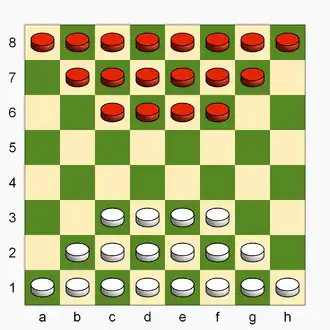 ![]() Starting position for American checkers on an 8×8 checkerboard; Black (red) moves first. | |