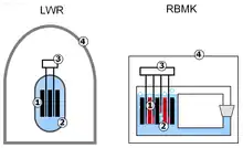 In power-generating operation, most of the heat generated in a nuclear reactor by its fuel rods is derived from nuclear fission, but a significant fraction (over 6%) is derived from the radioactive decay of the accumulated fission products, a process known as decay heat. This decay heat continues for some time after the fission chain reaction has been stopped, such as following a reactor shutdown, either emergency or planned, and continued pumped circulation of coolant is essential to prevent core overheating, or in the worst case, core meltdown.[15] RBMK reactors, like those at Chernobyl, use water as a coolant, circulated by electrically driven pumps.[16][17] The coolant flow rate is considerable – Reactor No. 4 had 1661 individual fuel channels, each requiring a coolant flow of 28 m3/h (990 cu ft/h) at full reactor power, for a total of over 45 million litres per hour (12 million gallons per hour) for the entire reactor.
