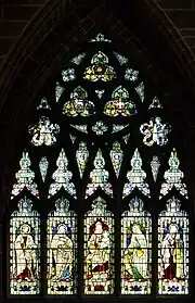 The quire is entered through a screen designed by George Gilbert Scott, with gates made by Skidmore. The rood was designed by Scott, and was made by F. Stuflesser.[4] The bishop's throne or "cathedra" was designed by Scott to complement the choir stalls. It was constructed by Farmer and Brindley in 1876. The reredos and the floor mosaic date from 1876, and were designed by J. R. Clayton. The east window has tracery of an elegant Decorated Gothic design which is filled with stained glass of 1884 by Heaton, Butler and Bayne.[44]