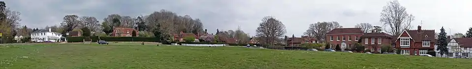 Panoramic of the eastern sector of Chiddingfold village green. The site of the bonfire in the left foreground.