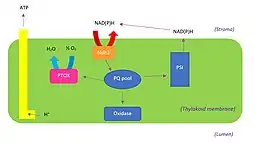 Initially, the presence of chlororespiration as a legitimate respiratory process in plants was heavily doubted. However, experimentation on Chlamydomonas reinhardtii, discovered Plastoquinone (PQ) to be a redox carrier.[2] The role of this redox carrier is to transport electrons from the NAD(P)H enzyme to oxygen molecules on the thylakoid membrane.[6] Using this cyclic electron chain around photosystem one (PS I), chlororespiration compensates for the lack of light. This cyclic pathway also allows electrons to re-enter the PQ pool through NAD(P)H enzyme activity and production, which is then used to supply ATP molecules (energy) to plant cells.[7]
