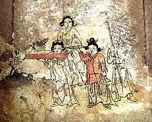 The earliest visual depictions of hanbok can be traced back to the Three Kingdoms of Korea period (57 BC to 668 AD).[56][57][58][59] The origin of ancient hanbok can be found in the ancient clothing of what is now today's Northern Korea and Manchuria.[60] Some hypothesize that the hanbok of antiquity can trace its origin to nomadic clothing of the Eurasian Steppes (Scythian clothing), spanning across Siberia from western Asia to Northeast Asia, interconnected by the Steppe Route.[61][62][63] Reflecting its nomadic origins in western and northern Asia, ancient hanbok shared structural similarities with hobok type clothing of the nomadic cultures in East Asia, designed to facilitate horse-riding and ease of movement,[14][64][65] such as the use of trousers and jacket for male clothing and the use of left closure in its jacket.[66] However, although the ancient hanbok reflects some similarity with the Scythian clothing, numerous differences between the two types of clothing have also been observed which led associated professor Youngsoo Chang from the Department of Cultural Properties in Gyeongju University in 2020 to suggest that the theory about Scythian clothing being the archetype of the ancient hanbok, a theory accepted as common knowledge in Korean academia, having to be revised.[66] It is also important to note that the Goguryeo tomb murals were primarily painted in two geographical regions: Ji'an (集安) and Pyeongyang.[67]: 15 The former is the second capital of Goguryeo while the latter is the third capital of Goguryeo from the mid-fourth to the mid-seventh centuries.[67]: 15 While the mural paintings found in regions Ji'an typically shows the characteristics of Goguryeo people in terms of their customs and morals; those from the regions of Pyeongyang typically show the cultural influences of the Han dynasty as the Han dynasty had governed this geographical region for approximately 400 years, including Chinese-style clothing.[67]: 15