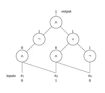 A Boolean circuit with input bits is a directed acyclic graph in which every node (usually called gates in this context) is either an input node of in-degree 0 labelled by one of the input bits, an AND gate, an OR gate, or a NOT gate. One of these gates is designated as the output gate. Such a circuit naturally computes a function of its inputs. The size of a circuit is the number of gates it contains and its depth is the maximal length of a path from an input gate to the output gate.