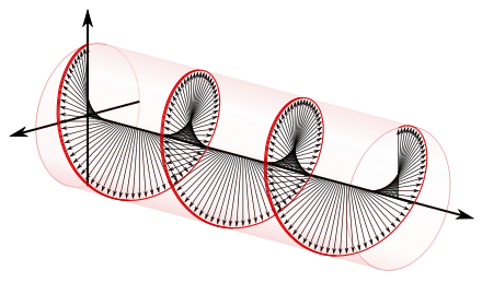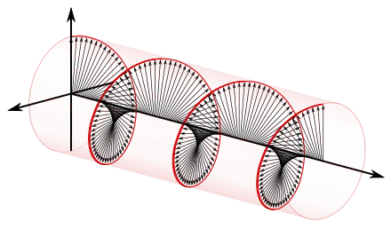 The electric field vectors of a traveling circularly polarized electromagnetic wave. This wave is right-handed/clockwise circularly polarized as defined from the point of view of the source, or left-handed/anti-clockwise circularly polarized if defined from the point of view of the receiver.