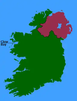 Clew Bay (/ˈkl/; Irish: Cuan Mó) is a large ocean bay on the Atlantic coast of County Mayo, Ireland. It is roughly rectangular and has more than a hundred small islands on its landward side; Ireland's best example of sunken drumlins. The larger Clare Island guards the entrance of the bay.