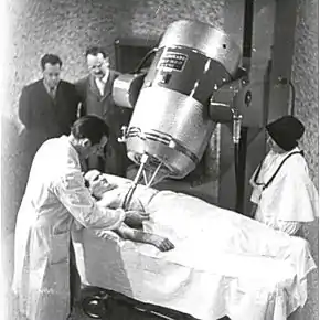 In 1949, Dr. Harold E. Johns of the University of Saskatchewan sent a request to the National Research Council (NRC) of Canada asking it to produce cobalt-60 isotopes for use in a cobalt therapy unit prototype. Two cobalt-60 apparatuses were then built, one in Saskatoon in the cancer wing of the University of Saskatchewan and the other in London, Ontario. Johns collected depth-dose data at the University of Saskatchewan which would later become the world standard.[3] The first patient to be treated with cobalt-60 radiation was treated on October 27, 1951, at the War Memorial Children's Hospital in London, Ontario.[4][5] In 1961 cobalt therapy was expected to replace X-ray radiotherapy.[6]: 14 In 1966, Walt Disney's lung cancer was treated with this procedure, but could not prevent his death.[7]