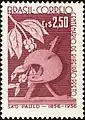- A commemorative stamp was issued in Brazil to mark the 50th anniversary of Japanese immigration. It depicts rice and coffee trees above and below agricultural implements. (1958)