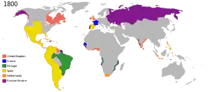Missionaries were active in practically all of the European-controlled colonies because the metropoles were Christian. Historian Philip Hoffman calculated that by 1800, before the Industrial Revolution, Europeans already controlled at least 35% of the globe, and by 1914, they had gained control of 84% of the globe.[7] In the aftermath of World War II colonial powers retreated between 1945 and 1975; over which time nearly all colonies gained independence, entering into changed colonial, so-called postcolonial and neocolonialist relations.