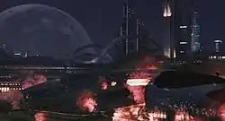 The music video for the song, directed by Dee Shin, was uploaded to 2NE1's YouTube channel on March 2, 2014.[46][47] Yang Hyun-suk described the music video as "set in a near-future city", with the concept revolving around the notion that people in the said era prefer the virtual world over the real one, similar to the movie The Matrix (1999). With the increasing focus and reliance of technology, the theme of the music video attempts to convey the "importance and humanity of reality". In addition, Yang commented that, "Up to now, 2NE1 has filmed a lot of music videos mainly showcasing the song's choreography, but this time I wanted to try new things."[48] In the computer generated graphics-heavy visual, the group is seen living in a futuristic world where one can escape reality and enter a "virtual paradise" with a special machine.[16] The dystopian-like real world features a normal girl (played by Dara) whose boyfriend is addicted to the virtual paradise and would rather be in the fantasy environment than with her. As a result, all four members go from their real world and transform into warrior rebels to infiltrate the virtual environment in order to destroy it from the inside. Filled with elaborate sets, special effects, and unique wardrobes, the video garnered notability for its high production value of half a million dollars to effectively exude a futuristic atmosphere, and has been compared to the likes of science fiction movies.[11][14][48]