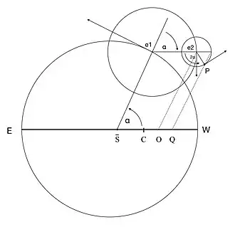 The planet itself, represented by the point P in the diagram, revolves uniformly from west to east around the circumference of the second epicycle, whose radius is exactly one third of that of the first, at twice the rate of revolution of e1 about S. This device enabled Copernicus to dispense with the equant, a much-criticised feature of Claudius Ptolemy's theories for the motions of the outer planets. In a heliocentric version of Ptolemy's models, his equant would lie at the point Q in the diagram, offset along the line of apses EW from the point S by a distance one and a third times the radius of Copernicus's first epicycle. The centre of the planet's deferent, with the same radius as Copernicus's, would lie at the point C, mid-way between S and Q. The planet itself would lie at the point of intersection of this deferent with the line QP. While this point only coincides exactly with P whenever they are both at an apsis,[lower-alpha 8] the difference between their positions is always negligible in comparison with the inaccuracies inherent to both theories.
