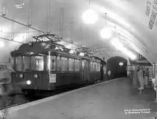 The line was officially opened by King Haakon VII on 27 June 1928.[17] It became the first underground railway in the Nordic countries, five years before Stockholm and six years before Copenhagen.[18] The tunnel was 1,620 meters (5,310 ft) long[16] and trams used three to four minutes to run through it.[17] It was used by two companies,: Holmenkolbanen and Akersbanerne, with Holmenkolbanen operating both the Røa Line and the Holmenkollen Line. The Sognsvann Line was to be connected to the tunnel from 10 October 1934, and the two companies needed to find an agreement for paying for trackage rights.[19] After negotiations failed, a decision was made by the Ministry of Labour on 7 July 1932, which stated that Akersbanerne would have to pay the additional fares collected for transport passengers through the tunnel, less the cost of running trains on the section.[20]
