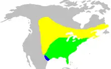Approximate range in North America Breeding range Year-round range Wintering range | |