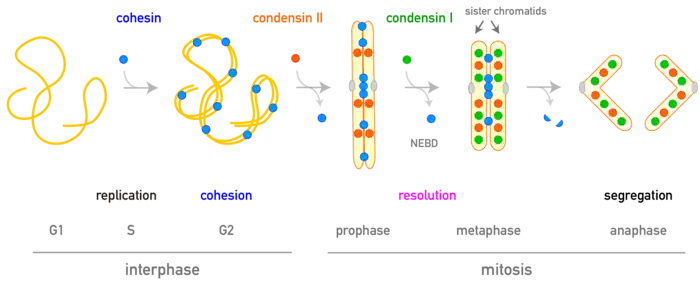 In human tissue culture cells, the two condensin complexes are regulated differently during the mitotic cell cycle (Figure 4).[55][56] Condensin II is present within the cell nucleus during interphase and participates in an early stage of chromosome condensation within the prophase nucleus. On the other hand, condensin I is present in the cytoplasm during interphase, and gains access to chromosomes only after the nuclear envelope breaks down (NEBD) at the end of prophase. During prometaphase and metaphase, condensin I and condensin II cooperate to assemble rod-shaped chromosomes, in which two sister chromatids are fully resolved. Such differential dynamics of the two complexes is observed in Xenopus egg extracts,[57] mouse oocytes,[58] and neural stem cells,[59] indicating that it is part of a fundamental regulatory mechanism conserved among different organisms and cell types. It is most likely that this mechanism ensures the ordered action of the two complexes, namely, condensin II first and condensin I later.[60]