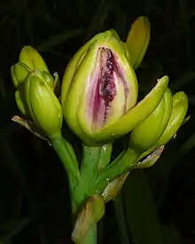 Damage to the bud of a Hemerocallis flower from larvae of C. quinquenotata | |