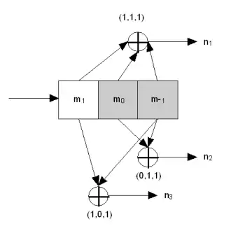 Shift-register for the (7, [171, 133]) convolutional code polynomial. Branches: , . All of the math operations should be done by modulo 2.