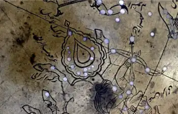 In Chinese astronomy, the stars of Corona Australis are located within the Black Tortoise of the North (北方玄武, Běi Fāng Xuán Wǔ).[74] The constellation itself was known as ti'en pieh ("Heavenly Turtle") and during the Western Zhou period, marked the beginning of winter. However, precession over time has meant that the "Heavenly River" (Milky Way) became the more accurate marker to the ancient Chinese and hence supplanted the turtle in this role.[75] Arabic names for Corona Australis include Al Ķubbah "the Tortoise", Al Ĥibā "the Tent" or Al Udḥā al Na'ām "the Ostrich Nest".[70][72] It was later given the name Al Iklīl al Janūbiyyah, which the European authors Chilmead, Riccioli and Caesius transliterated as Alachil Elgenubi, Elkleil Elgenubi and Aladil Algenubi respectively.[70]