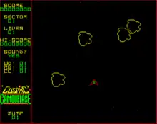The player controls a spaceship in order to avoid and destroy asteroids. The controls are rotate, thrust and fire. It expands on Meteors by introducing different types of asteroids and enemies, and a limited use camouflage function that allows the player to pass through asteroids and enemies.