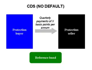 If the reference bond performs without default, the protection buyer pays quarterly payments to the seller until maturity