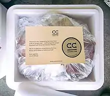 The animal is split into about 50 allotments.[52] After customers have purchased sufficiently profitable portions of a head of cattle, they each are given the date at which the meat will be sent to them and a photo of a cow on its website will "tip" over.[43][42] In a similar practice followed by Kickstarter, customers do not need to pay when the cow does not "tip".[15][53] A cow is "tipped" after customers choose 67% of it.[5] The cow is then slaughtered, packed up, and branded with a barcode.[54] The cow is delivered to a Crowd Cow distribution location, of which it had two in 2017.[6] After being placed in a Styrofoam cooler stuffed with dry ice, the meat is frozen and mailed to the customer in a box with vacuum packing.[43] Crowd Cow includes around four recipes about how to cook the meat based on the parts of the cow chosen by the customer.[46]