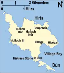 Dùn is an island in St Kilda, Scotland. It is nearly 1 mile (1.6 kilometres) long. Its name simply means "fort" in Scottish Gaelic (for more information, see "dun"), but the fort itself has been lost – old maps show it on Gob an Dùin (NF109972), which is at the seaward end.