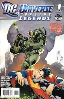 DC Universe Online: Legends is a comic book limited series published by DC Comics. It debuted on February 2, 2011, and is an expansion of the story of the DC Universe Online MMORPG video game. The series was written by the game's story co-writer Marv Wolfman and Tony Bedard with Tom Taylor penning issues #16 and 17. Originally announced as a 52-issue yearlong weekly series,[1] it was instead solicited as a bi-weekly series slated to have 26 issues.[2] Although solicitations for DC Universe Online: Legends, along with many other comics, were dropped from the DC Comics website and Diamond/Alliance pre-order catalogs beginning September 2011 as part of DC's new continuity reboot, the remaining issues returned to the publisher's lineup with the October 2011 solicitations. By August 2012, three paperback books were published, collecting the entire series.