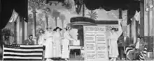By 1917, the organization was 600 members strong, many of whom were helping to support the effort in World War I.[17] In spite of member requests to disband the organization and donate all its funds to the war efforts, the DESA remained intact, with its members broadening their patriotic endeavors.[18] On April 10, Dallas suffragists took part in the "Dallas Patriotic Parade" hoisting a large sign proclaiming "Men of America, We Will Do Our Share", which help build support for their cause.[19] That same year, they produced a fund-raising musical comedy stage production in January called The Polynesian Princess.[20] Featuring popular music and entertainment, it helped the DESA raise $800.[20] For three days in March 1917, the DESA conducted the "Suffrage School" sponsored by the National Equal Suffrage Association, meant to educate the public about the benefits of women's suffrage.[21]