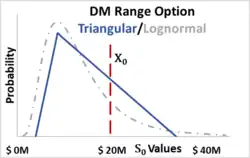 For a triangular distribution, sometimes referred to as three-point estimation, the mode value corresponds to the “most-likely” scenario, and the other two other scenarios, “pessimistic” and “optimistic”, represent plausible deviations from the most-likely scenario (often modeled as approximating a two-sided 1-out-of-10 likelihood or 95% confidence).[27][28][29][30] This range of estimates results in the eponymous name for the option, the DM Range Option.[31] The DM Range Option method is similar to the fuzzy method for real options. The following example (Fig. 7) uses a range of future estimated operating profits of a (pessimistic), b (optimistic) and m (mode or most-likely).