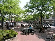Brick paving was introduced in Davis Square in 1900 and the area continued to be a vibrant commercial and transportation center until post-World War II, with the exodus to the suburbs and the decline of urban centers throughout the nation. In 1914, the Somerville Theater opened, hosting silent films as well as burlesque shows.[7] In 1927, the trains that had brought many people to Davis Square were re-routed. This also contributed to Davis Square's decline in the middle part of the 20th century. Factories shut, businesses failed and residents began to move out to the suburbs. As a result, Davis Square lost many of its tenants and became home to "burn-out storefronts" and "bars where motorcycle gangs hung out."[7] According to a planning study completed in 1980, Davis Square suffered from "a lack of competitiveness among merchants, traffic congestion, inadequate parking and an increasingly deteriorated physical environment."[8]